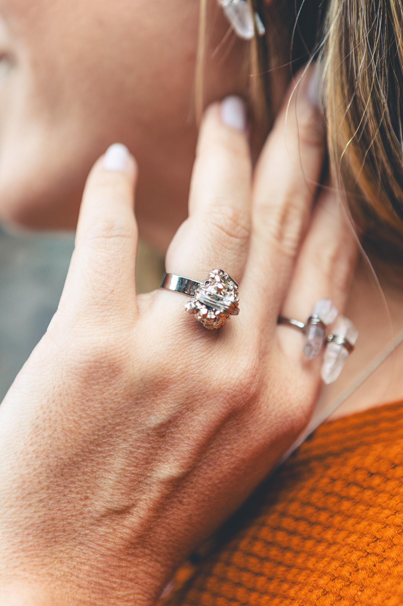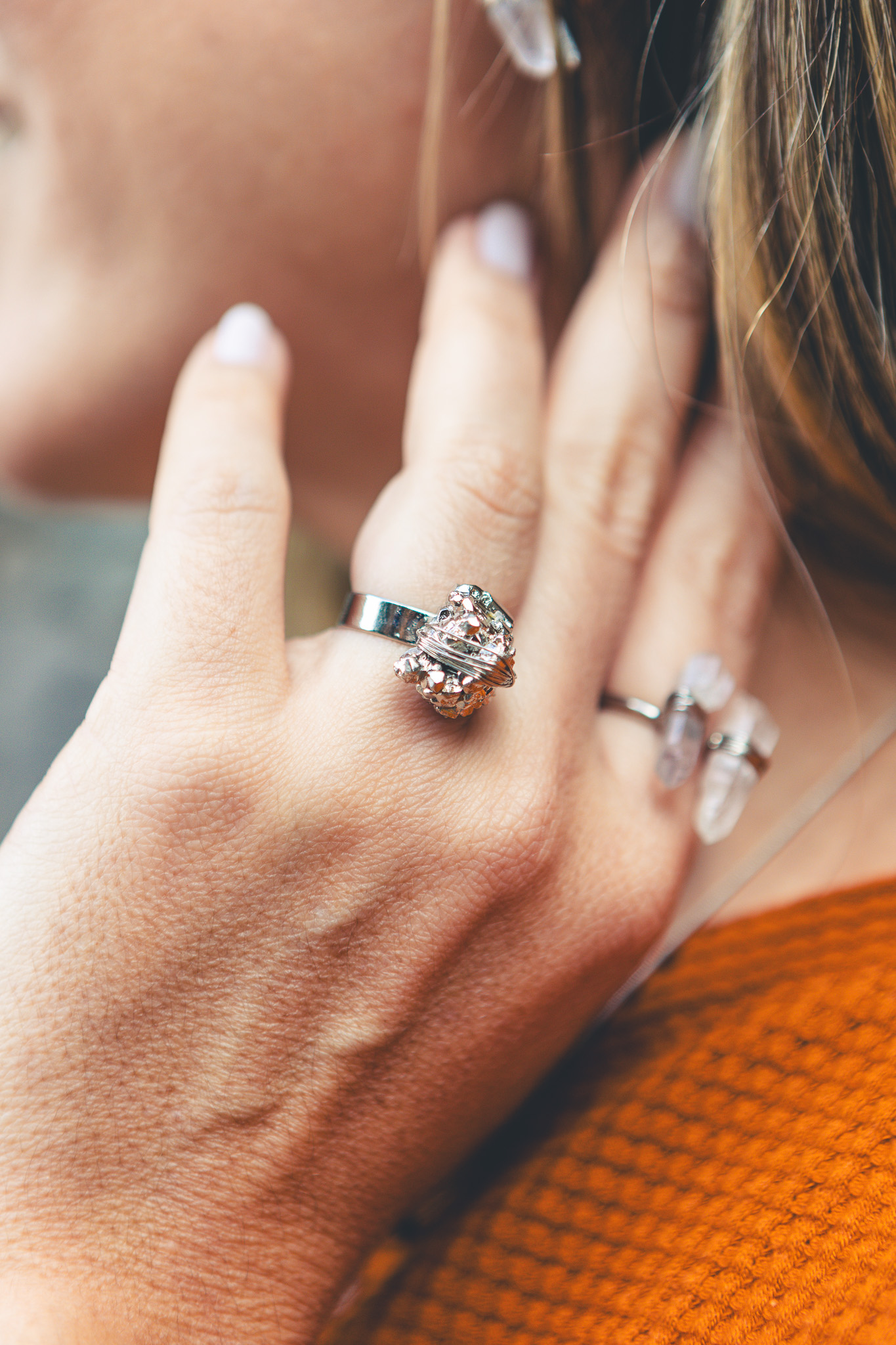 Anel Aro regulável com Pirita bruta soldada em banho de níquel.
