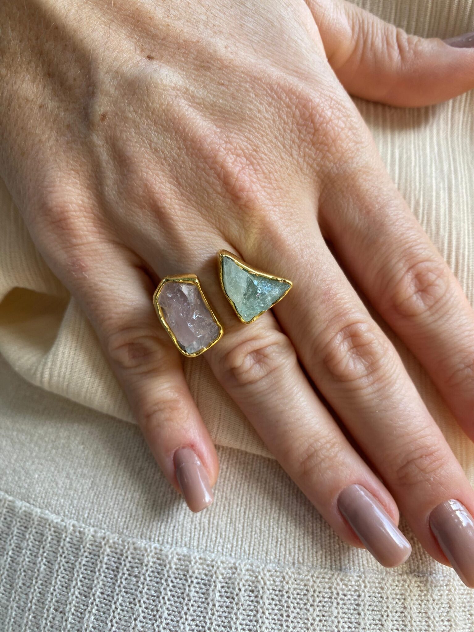 Anel regulável com banho de ouro 18k no modelo duplo moldurando a pedra bruta.