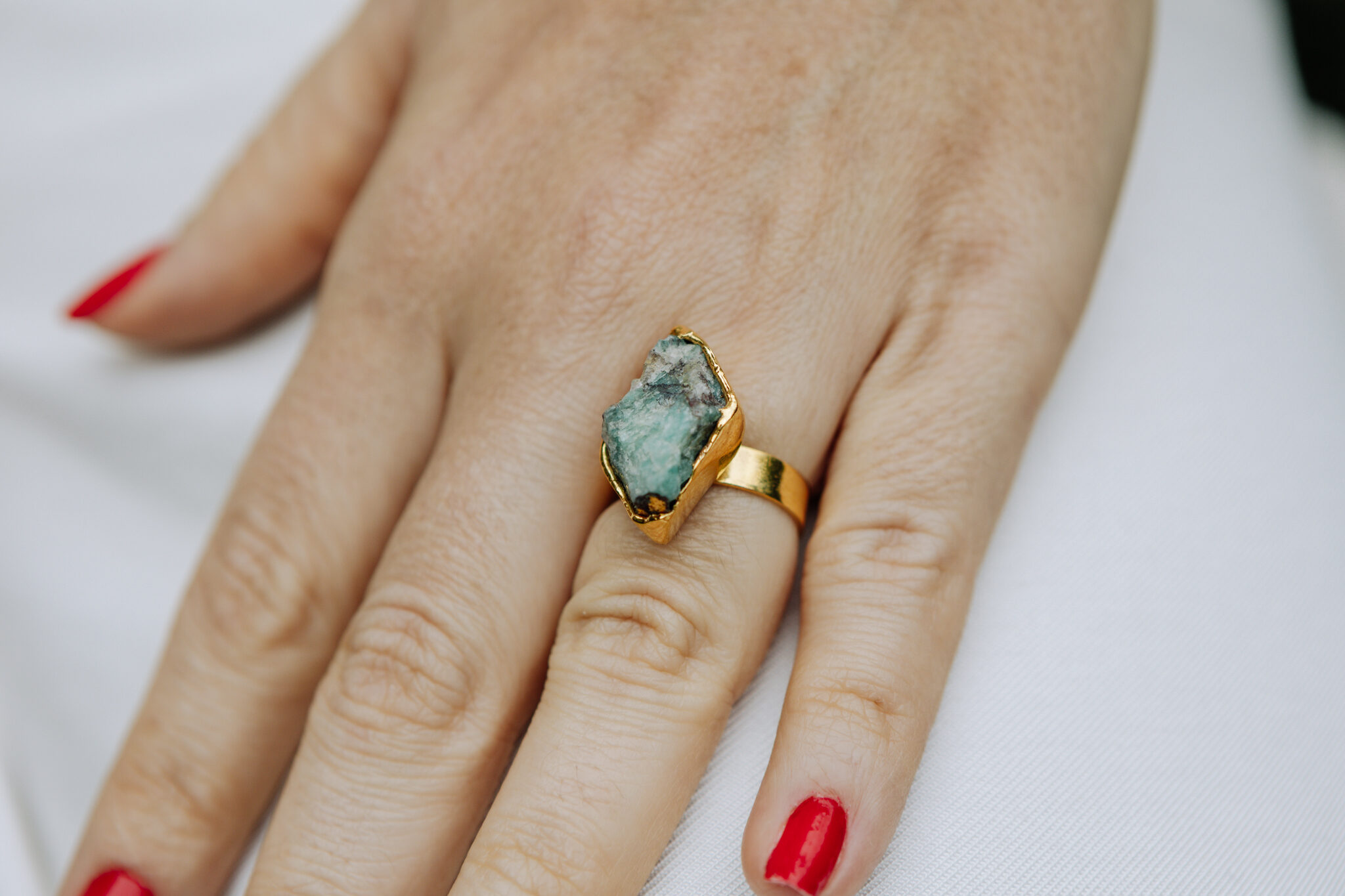 Anel regulável com banho de ouro no modelo stone com pedra bruta moldurada.