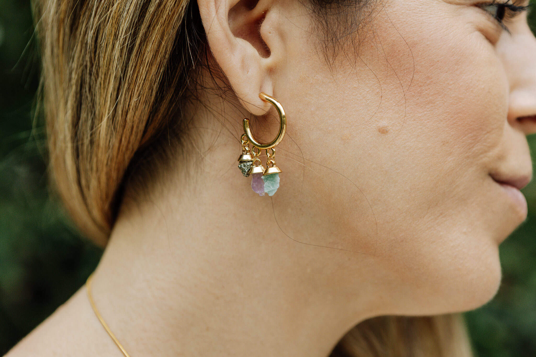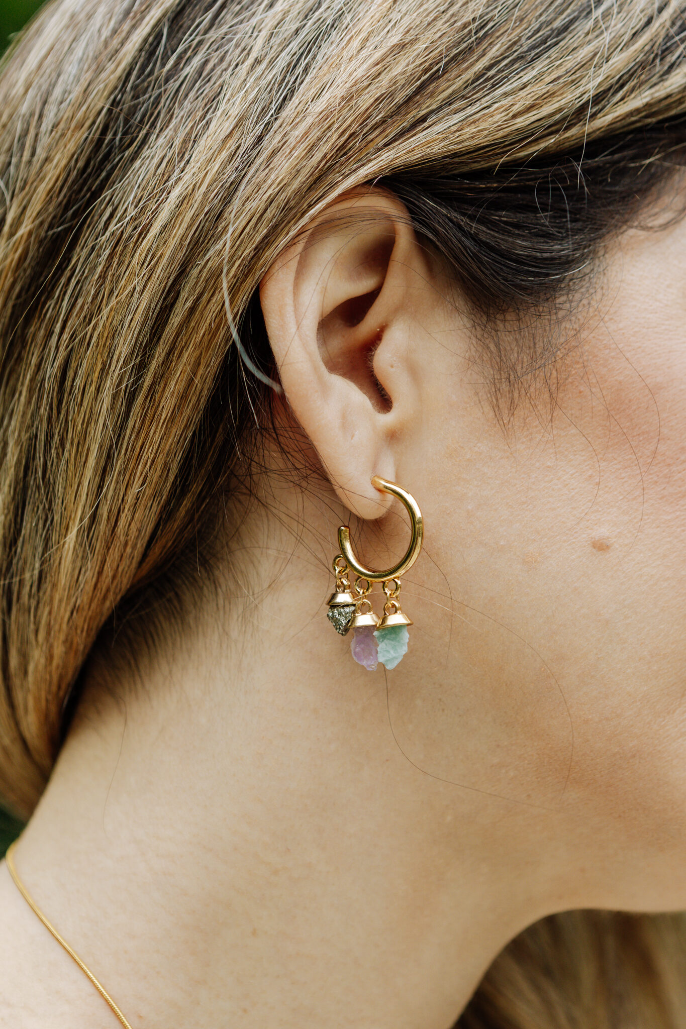 A argola é feita em metal com banho em ouro 18k e leva trés pedras naturais: amazonita, ametista e pirita seu estilo mais bruto.
