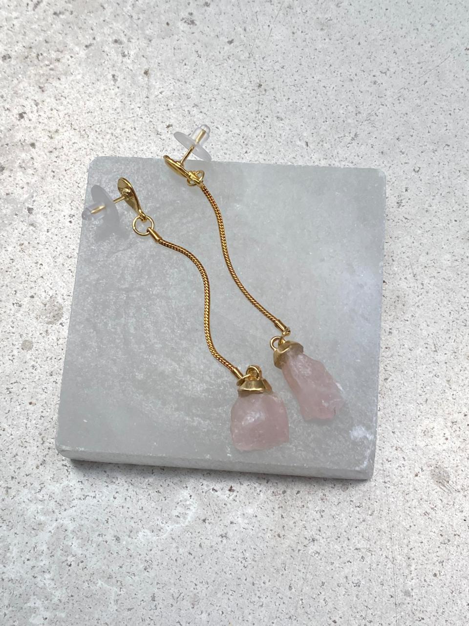 O brinco é feito com corrente com banho em ouro 18k e leva uma pedra natural: Quartzo Rosa em seu estilo mais bruto.