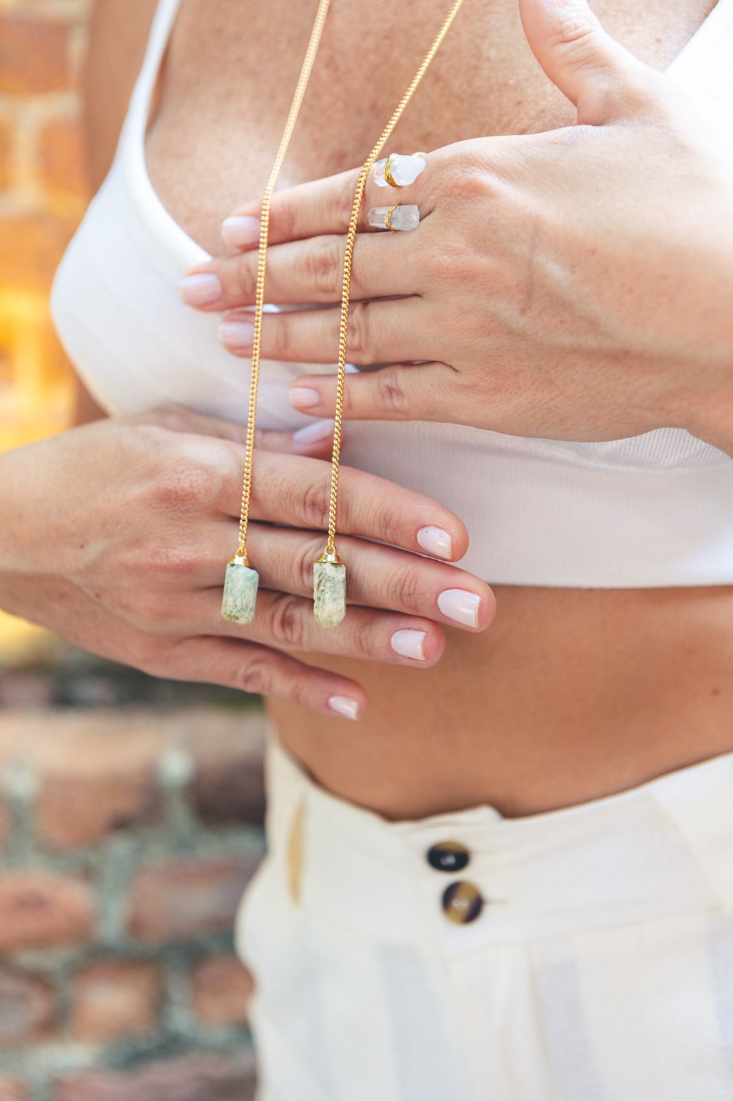Choker básica com dois fios com correntes finas e pedra bruta nas suas pontas. Podendo usar em 2 formas: com os fios para frente ou com o detalhe liso na frente e os fios com as pedras brutas nas costas