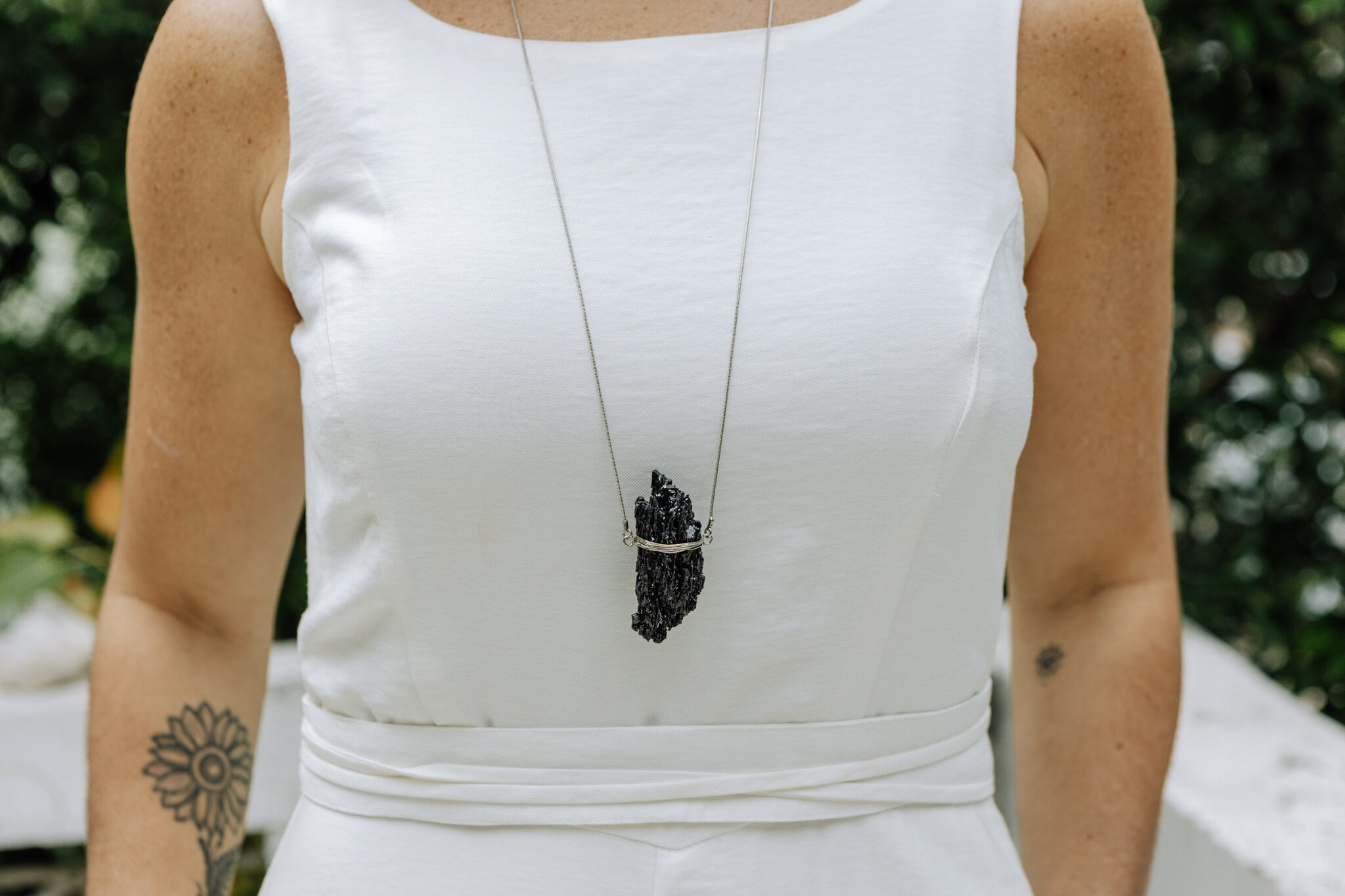 O Colar é feito em metal com banho de níqurl. O pingente leva uma pedra natural: Sílica, mantendo seu estilo mais bruto, envolta em metal prateado.