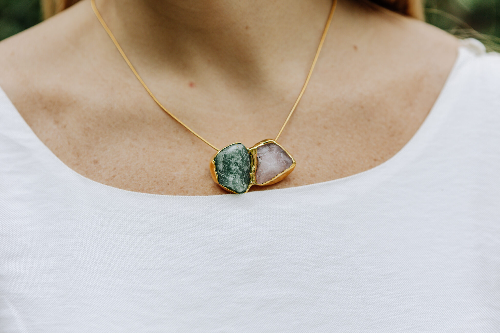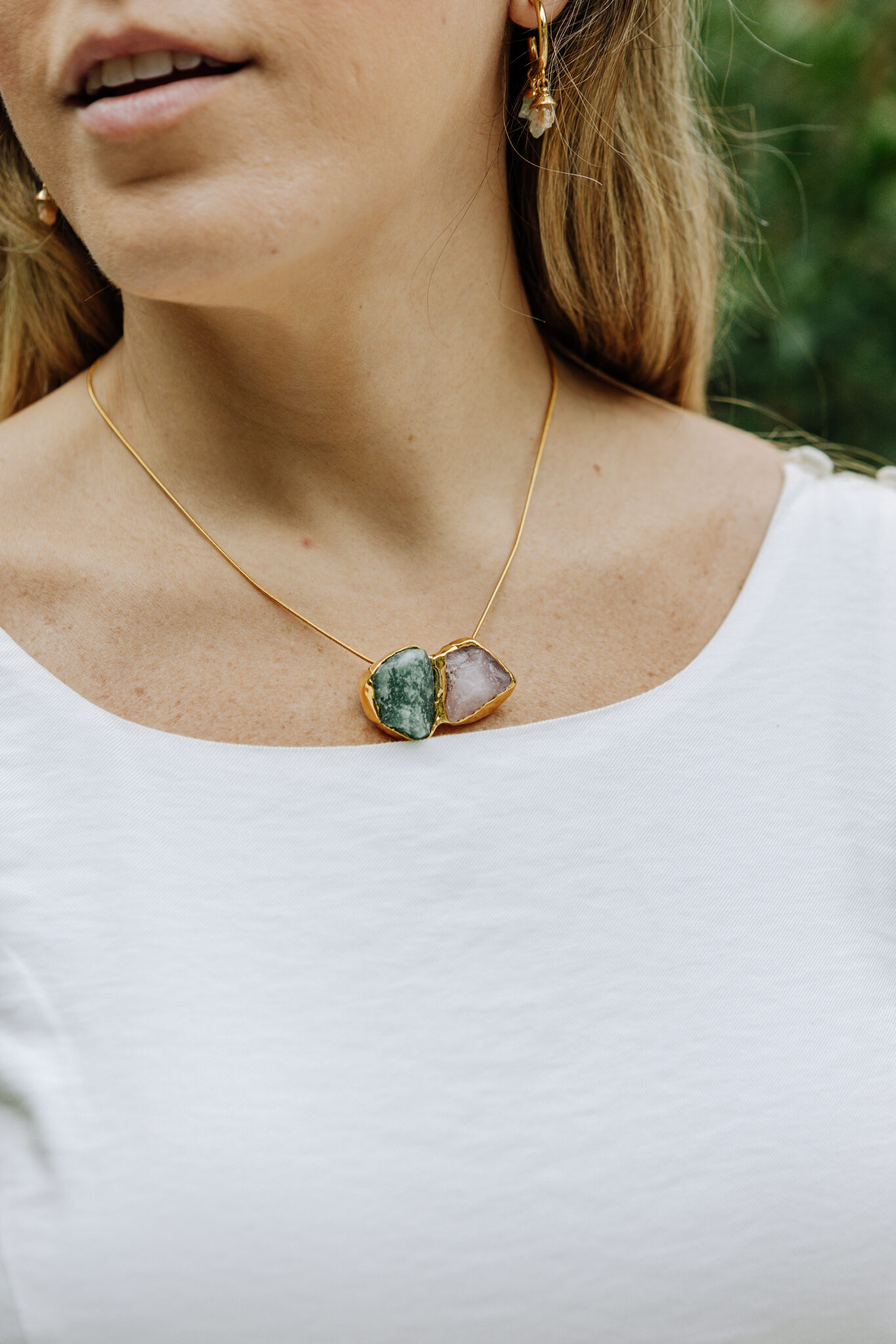 O Colar é feito em metal com banho de ouro 18k. O pingente leva duas pedras naturais: Quartzo Verde e Quartzo Rosa, mantendo seu estilo mais bruto, envolta em metal dourado soldado em um tubo.