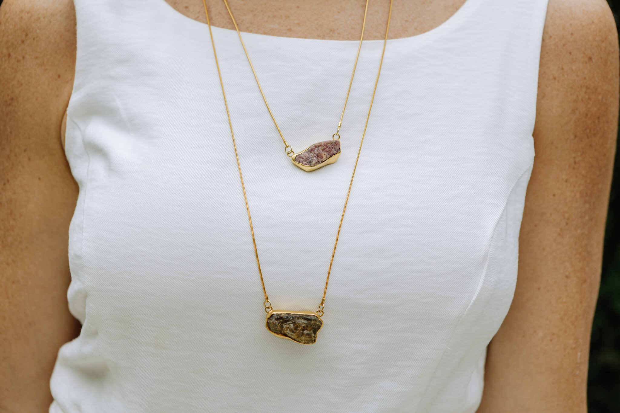 O Escapulário é feito em metal com banho de ouro 18k. O pingente leva duas pedras natural: Rubi e Quartzo Rutilado, mantendo seu estilo mais bruto e envolta em metal dourado.