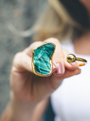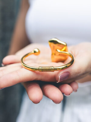 Pulseira com aro e molinha na parte de trás com duas pedras brutas molduradas no formato da pedra em banho de ouro 18k
