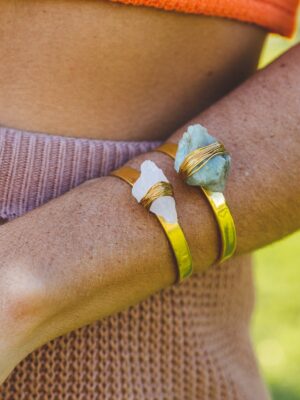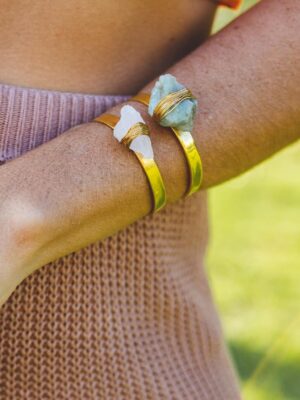 Pulseira aro ondulado banhado a ouro 18k e envernizado com 3 pingentes ( turmalina, olho grego e cianita azul ) que podem ser removidos