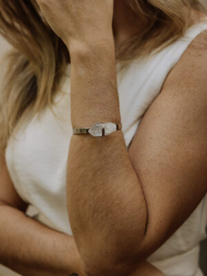 Pulseira aro ondulado banhado a ouro 18k e envernizado com 3 pingentes ( turmalina, olho grego e cianita azul ) que podem ser removidos
