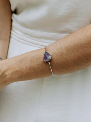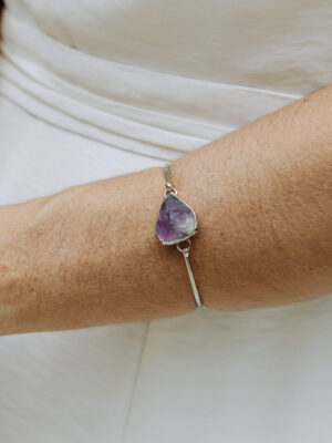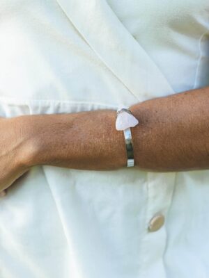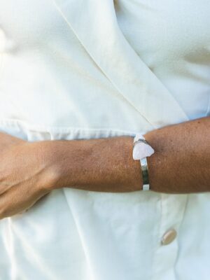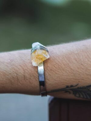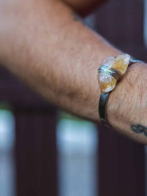 A pulseira é feito em metal com banho de ouro 18k e leva duas pedras naturais: Angelita mantendo seu estilo mais bruto, envolta em metal dourado e na parte de trás uma molinha super confortável.