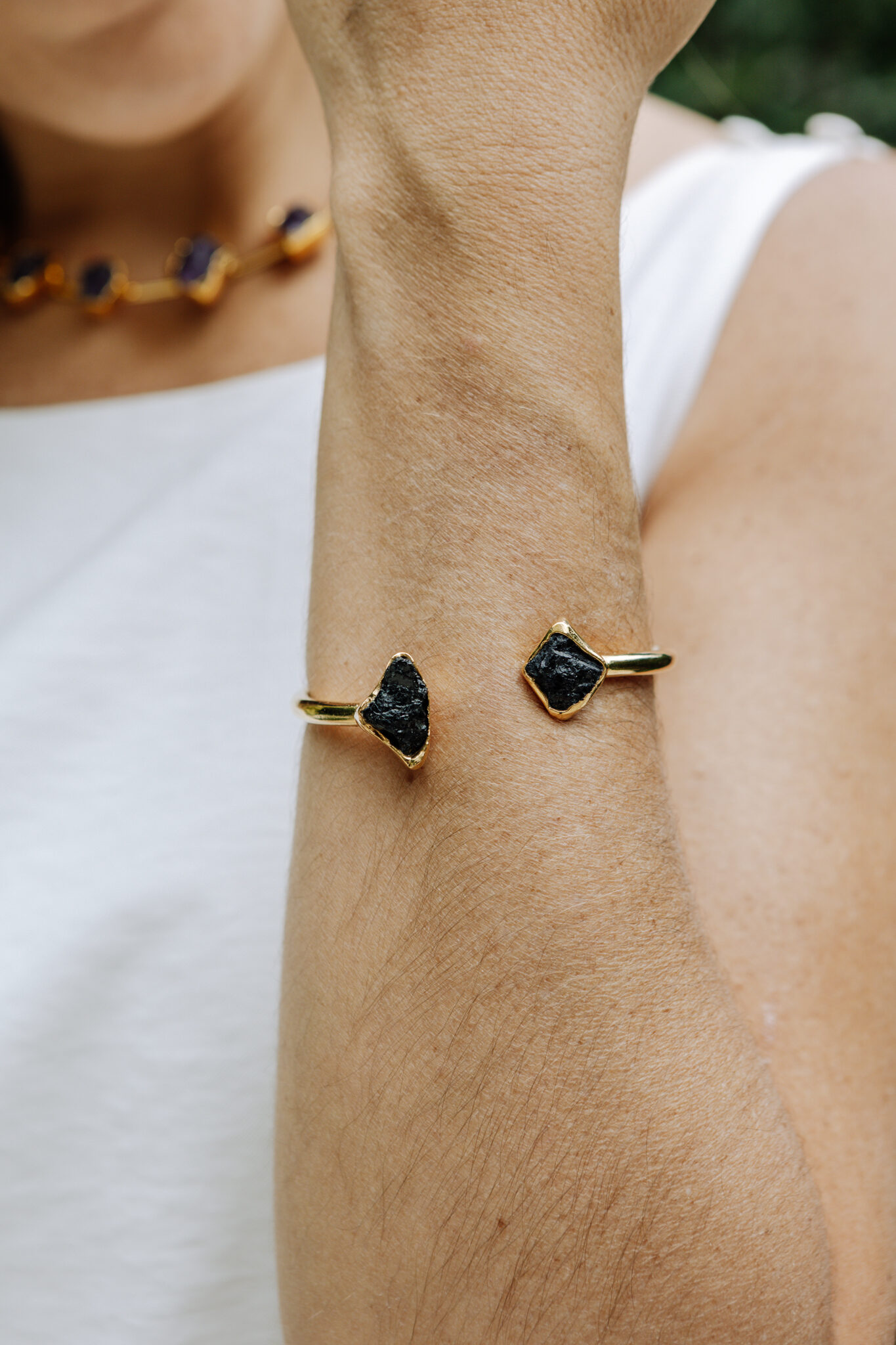 A pulseira é feito em metal com banho de ouro 18k e leva duas pedras naturais: Turmalina Negra mantendo seu estilo mais bruto, envolta em metal dourado e na parte de trás uma molinha super confortável.